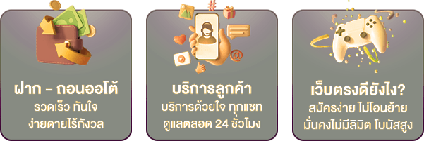 ตอบ : - ระบบฝาก-ถอนอัตโนมัติรวดเร็ว รองรับธนาคารชั้นนำ มีโปรโมชั่นและโบนัสมากมาย อัตราการจ่ายเงินสูง มีทีมงานดูแล 24 ชม.